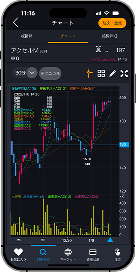 『ノーマルモード』は、プロが使うテクニカル分析が可能な高機能のチャートを搭載しており、チャートからワンタップで発注可能です。