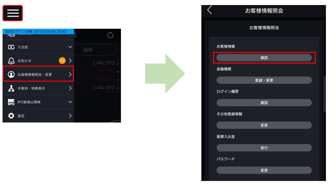 マイページもしくは取引ツールの[お客様情報]にて、登録情報の確認ができます。