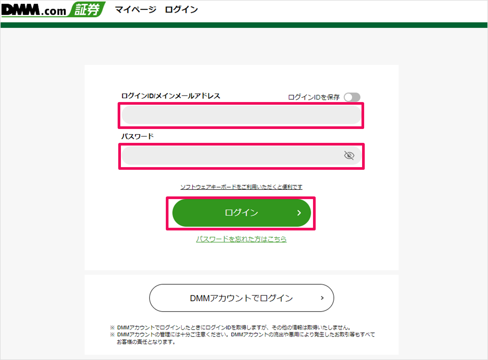 【DMM 株 】ホームページの[ログイン]をクリック