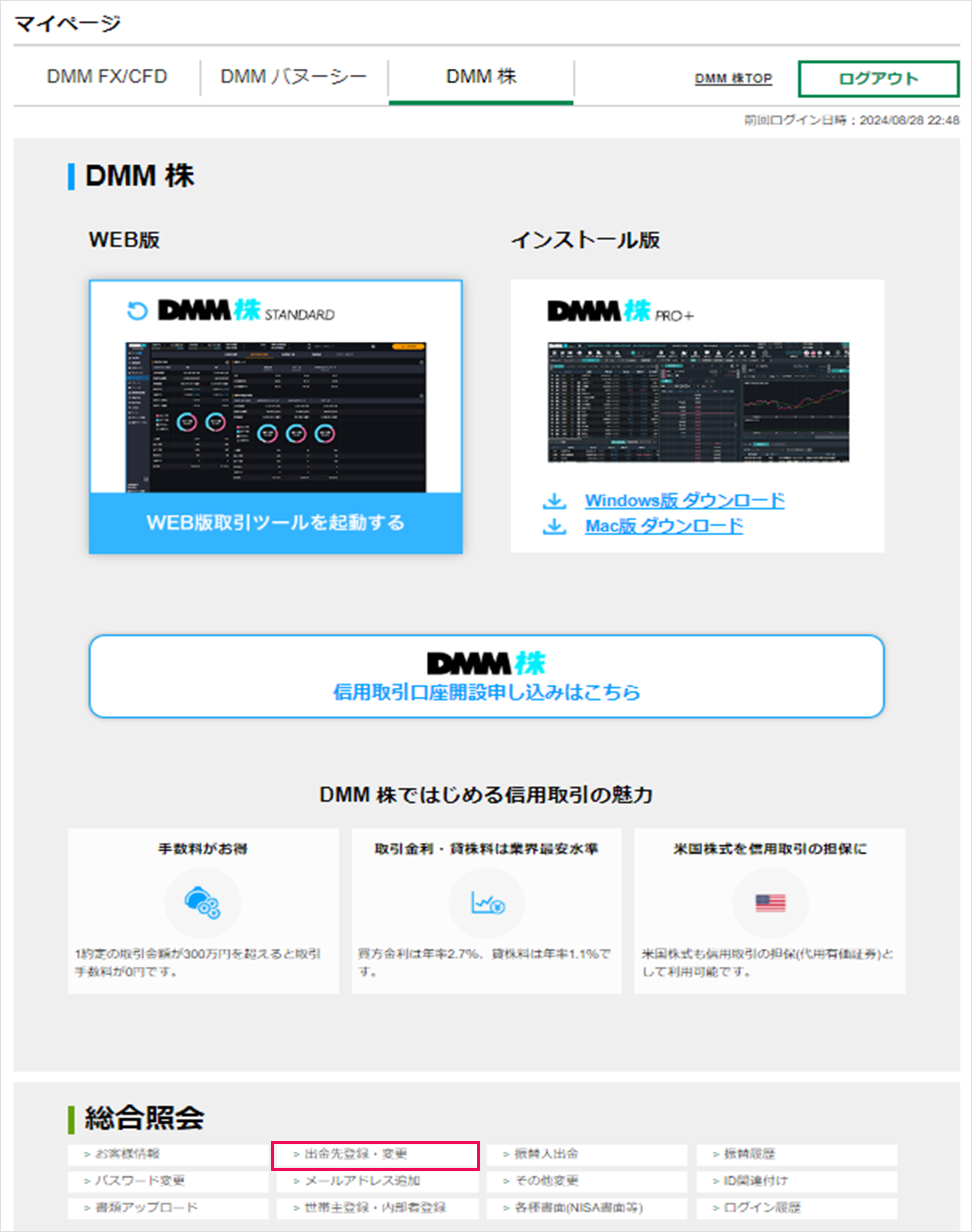 マイページ>「総合照会」の[出金先登録・変更]をクリック
