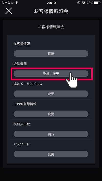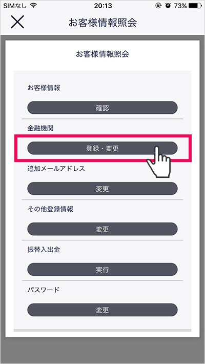 金融機関の[登録・変更]をタップ