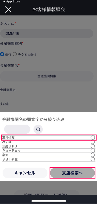 金融機関を指定して[支店検索へ]をタップ