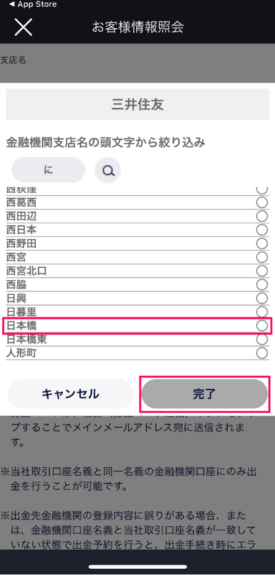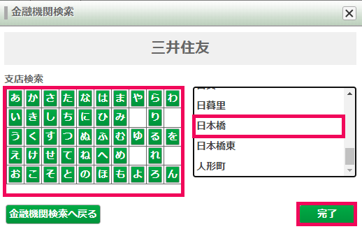 50音から支店名の頭文字をクリックし、表示される候補から対象の支店名を指定して[完了]をクリック