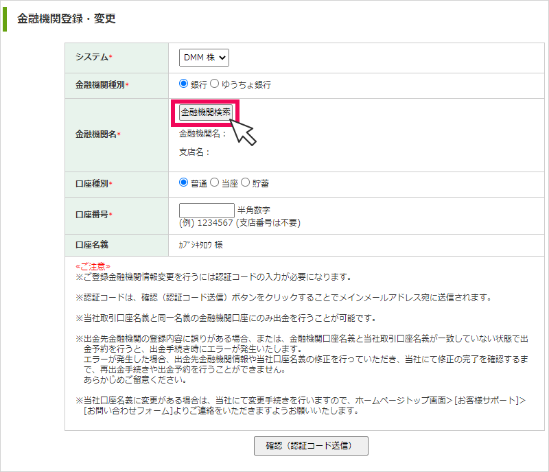 金融機関登録・変更画面で[金融機関検索]をクリック