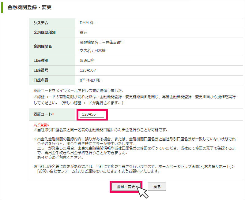 メールで届いた認証コードを入力し、[登録・変更]をクリックして完了
