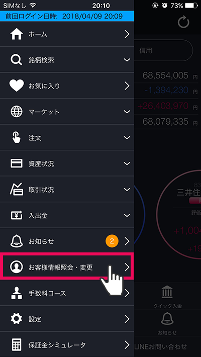 画面左上の[≡](メニュー)>[お客様情報照会・変更]をタップ
