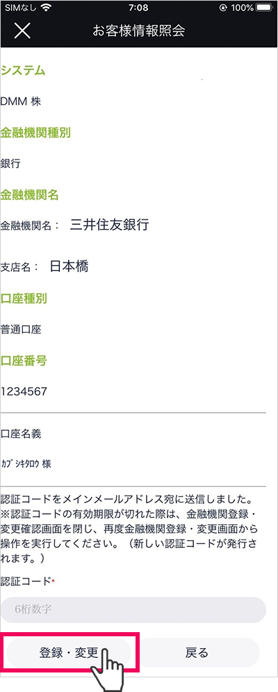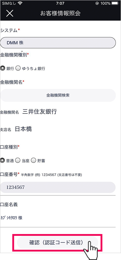 内容確認後、[確認(認証コード送信)]をタップ