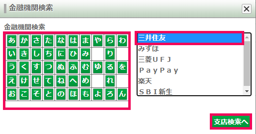 金融機関を指定して[支店検索へ]をクリック