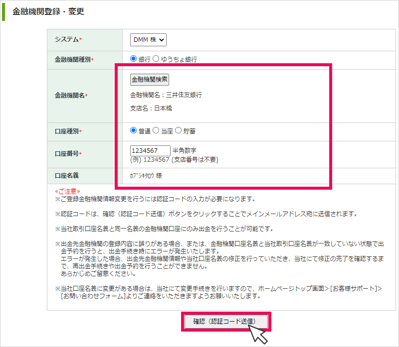 内容確認後、[確認(認証コード送信)]をクリック