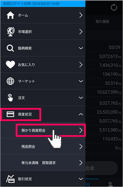 画面左上部の[≡](メニュー)より[資産状況]>[預かり資産照会]をタップします。