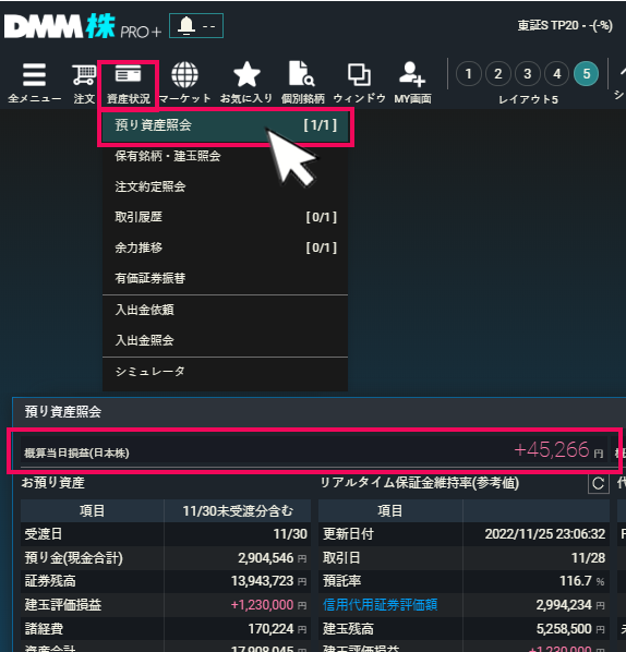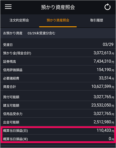 預かり資産照会画面にて、概算当日損益をご確認いただけます。