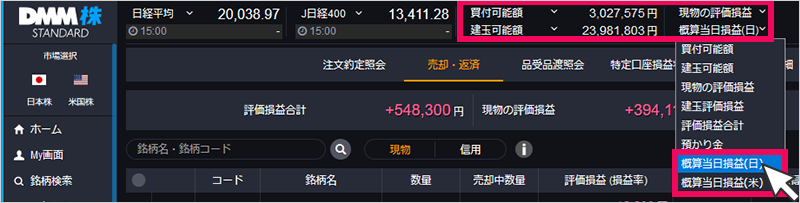 画面上部の情報エリアにて、概算当日損益(日)または概算当日損益(米)を選択し、ご確認いただけます。