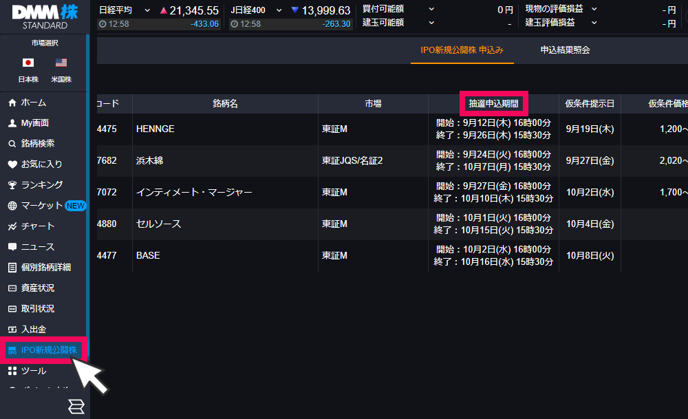 - [IPO新規公開株]をクリックし、銘柄ごとの抽選申込期間を確認。