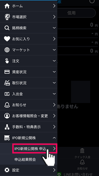 - [IPO新規公開株]>[IPO新規公開株 申込]をタップ。