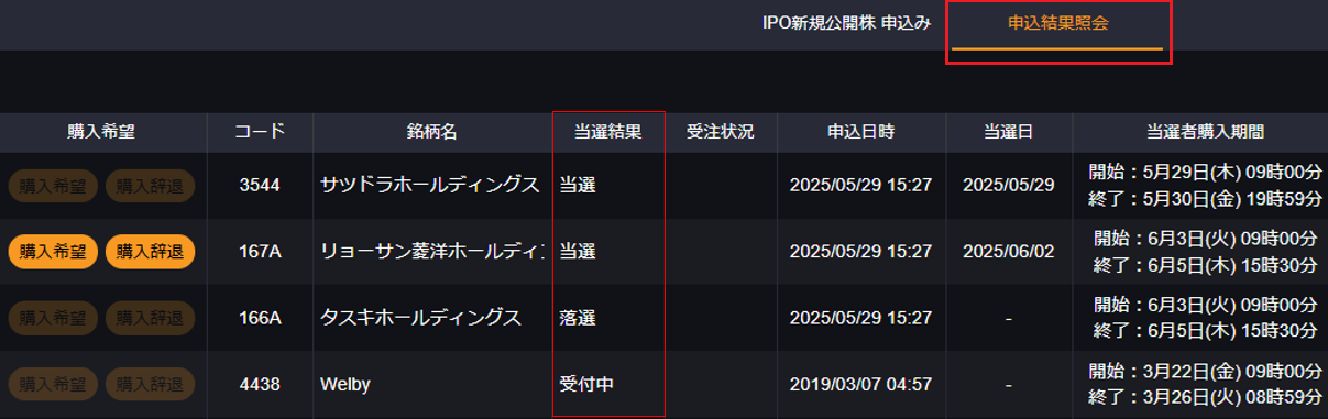 IPOの抽選参加申込内容や抽選結果はどこで確認できますか?