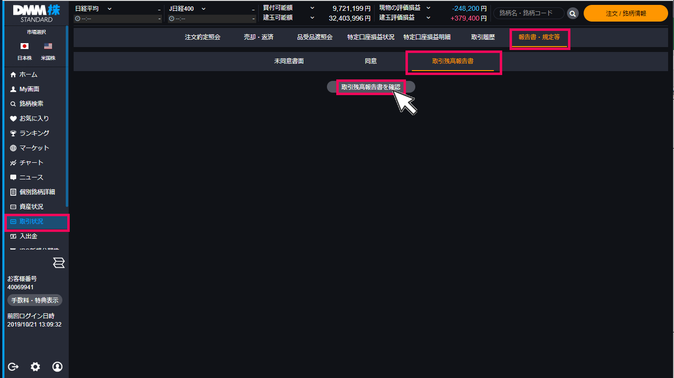 「取引状況」>「報告書・規定等」>[取引残高報告書]からご確認いただけます。