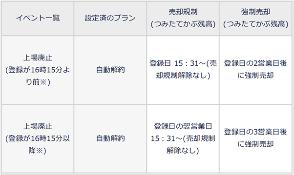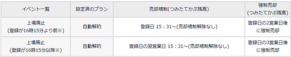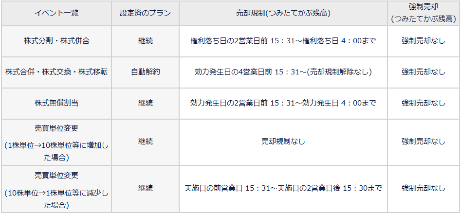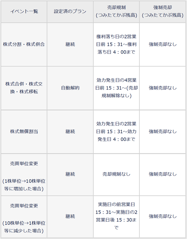 コーポレートアクションが発生した際は、プランが自動解約されたり、売却制限の期間が設けられたり、その後、つみたてかぶで取得した単元未満株部分が強制売却されることがございます。