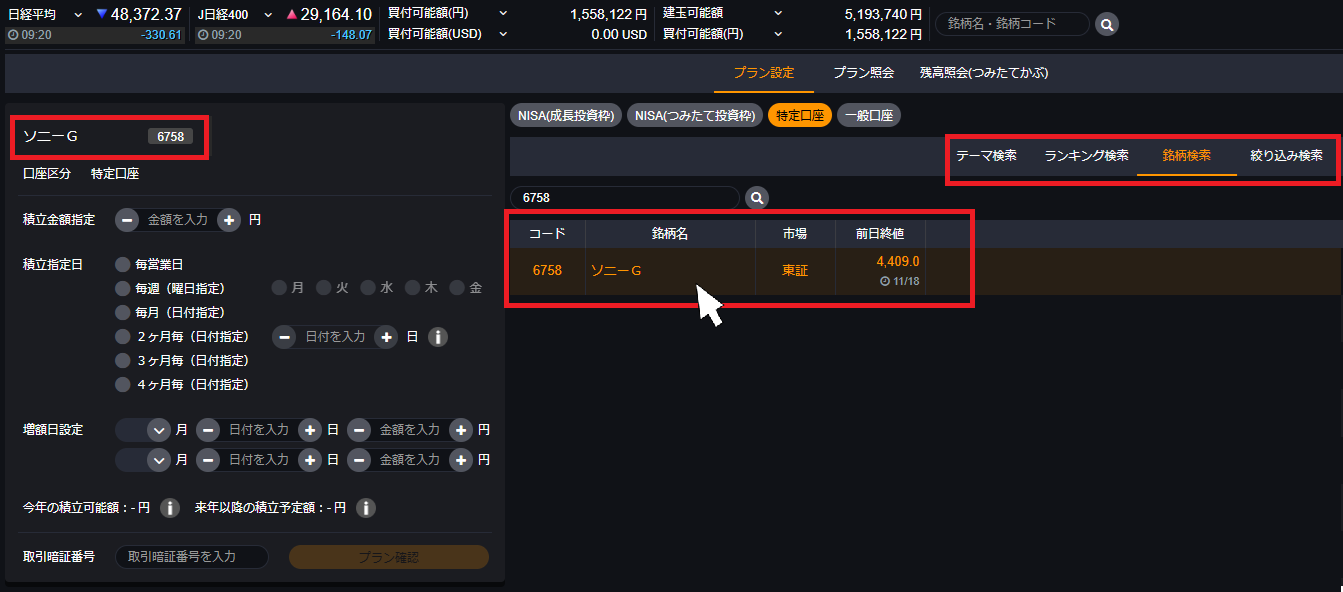 3. [テーマ検索][ランキング検索][銘柄検索][絞り込み検索]より銘柄を検索して、銘柄をクリックします。