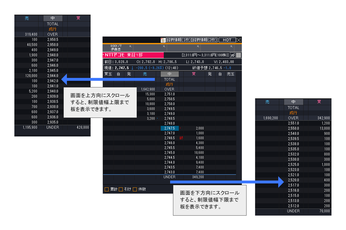 画面を上下にスクロールすると、制限値幅まで板を表示します。